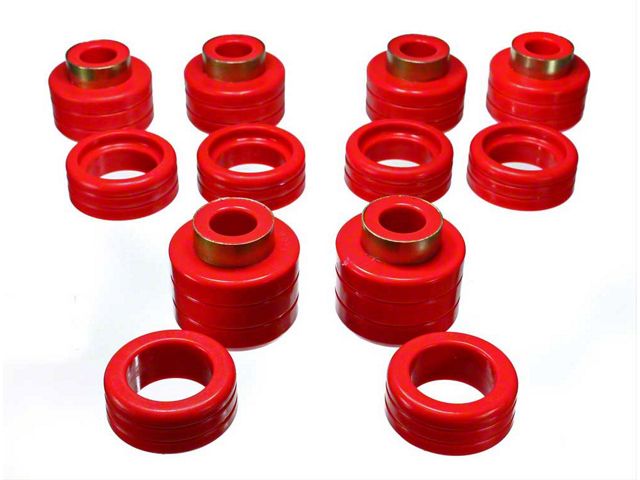 Energy Suspension's body mount kit will replace distorted and worn-out original rubber mounts to maintain truck cab to bed alignment. Original rubber mounts are so soft they often crack, distort, and crush so badly they often fall off. Aluminum body mounts are too harsh for street use that they tend to break and cause other components to break. Energy Suspension's specially formulated Hyper-Flex(r) polyurethane cab and body mounts combine the best qualities of both: they're soft enough for a smooth ride, yet rugged enough for the most demanding road or track. Most sets have a strong zinc plated steel ring molded into them for added durability and when the application requires it.