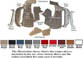 1990-93 Poly Back carpet sets feature the same hard-rubber backing used by the factory to reduce heat and noise in your Corvette. All Carpet sets include molded heel pads, serged bindings and Velcro strips to hold the floor mats in place and door panel carpet strips.