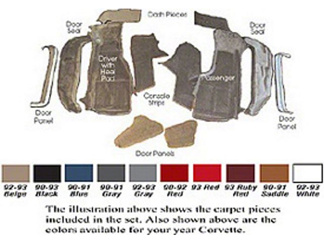 1990-1993 Mass Back carpet sets feature the same hard-rubber backing used by the factory to reduce heat and noise in your Corvette. All carpet sets include molded heel pads, serged bindings and velcro strips to hold the floor mats in place and door panel carpet strips