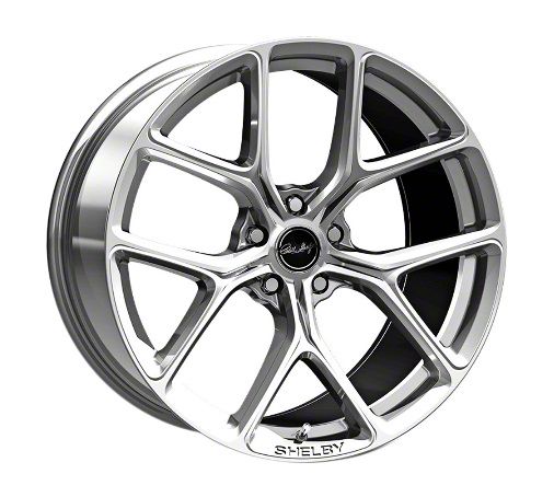 20x9.5", flow-formed Y spoke design emulating the Mustang Performance Pack 2 upgraded wheels. Engraved with the Shelby logo on the lip. Also available in Gunmetal and Black, as well as a 20x11" for the front (if you choose to run staggered). They are compatible with most late-model, big brake systems.