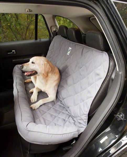 We thought of everything when designing and building this seat protector. It protects your back seat area from dirt, dog hair, paw scratches and debris, and provides a comfortable space for your dog. The protector features a full wraparound headrest for your dog, non skid backing material, elastic straps with hooks, and adjustable headrest straps to keep it firmly in place. No sliding around for your dog with this back seat protector. The overall fit is spot on, and it has precisely fitted openings to allow for seat belts and/or child car seat use. The result is a cleaner car for you and a more comfortable space for your dog. Colors Grey and Tan