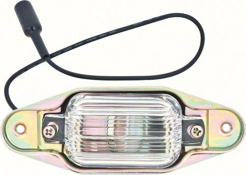 Reproduction rear license lamp assembly for various 1967-1991 Chevrolet and GMC truck models as listed. Each lamp assembly is manufactured to OE factory specifications and replicates the original in design, fitment, and originality. and includes the housing, lens, socket with pigtail and bulb.