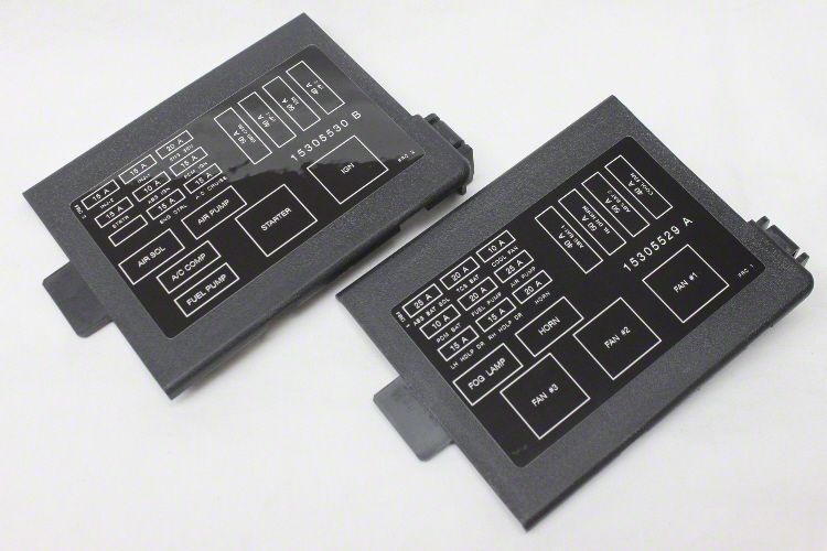 Construction and Features. These covers are finished in matte black and include matte white finish diagram decals for easy identification of fuses. Built with durability in mind, they match the original GM part number and provide a reliable replacement option for worn or damaged fuse box covers.