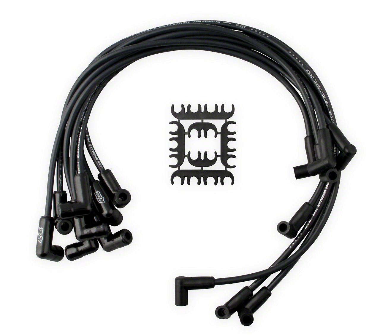 ACCEL Extreme 9000 Ceramic Boot Wires feature ultra high-temperature, double silicone, 8mm, 500 ohms/ft Ferro-Spiral core wire developed for performance use. The wire is rated at 600 degrees Fahrenheit peak and the black Ceramic boots withstand up to 2,000 degrees. Great for running headers with close tolerances, an engine bay with little room or an application with high under-hood temps. ACCEL Extreme 9000 wires offer excellent energy delivery to the spark plugs through stainless steel spark plug terminals, while providing the highest level of RFI/EMI suppression.