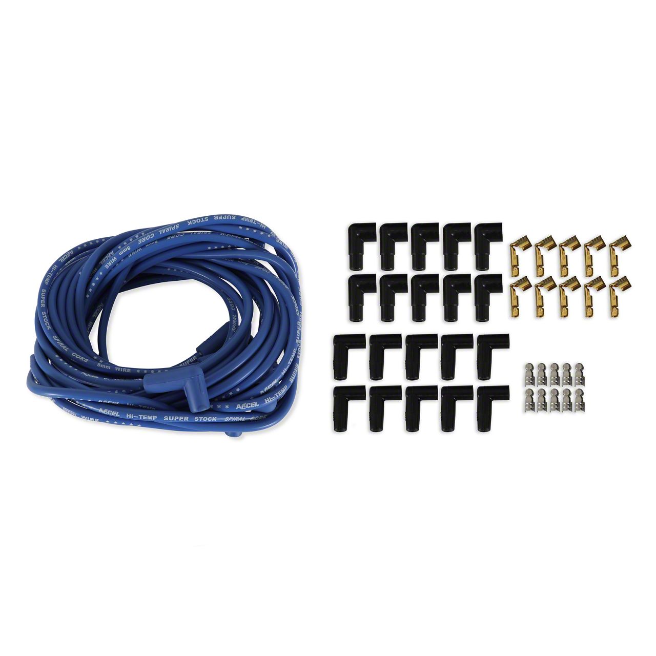 The traditional ACCEL combination of yellow wire and red spark plug boots has been added to these SuperStock Spiral Core 5000 Series wire sets, which feature color-matched wire and spark plug boots in blue, black, and red. With only 500 ohms/ft. of resistance, more ignition energy can reach the spark plug, producing a longer-lasting, hotter spark flame kernel. The results is higher performance through improved efficiency, quicker throttle response, and reduced emissions. This 8mm wire's double silicone construction is rated to 550 degrees F. The high-gloss wire jacket resists moisture, chemicals, and heat extremes for longer life and great looks. The fiberglass braid adds greater pull strength and terminal retention, while the stainless steel spark plug terminals provide excellent long life, electrical conductivity, and corrosion resistance. Both universal and custom-fit applications are available for early and late model cars and trucks.