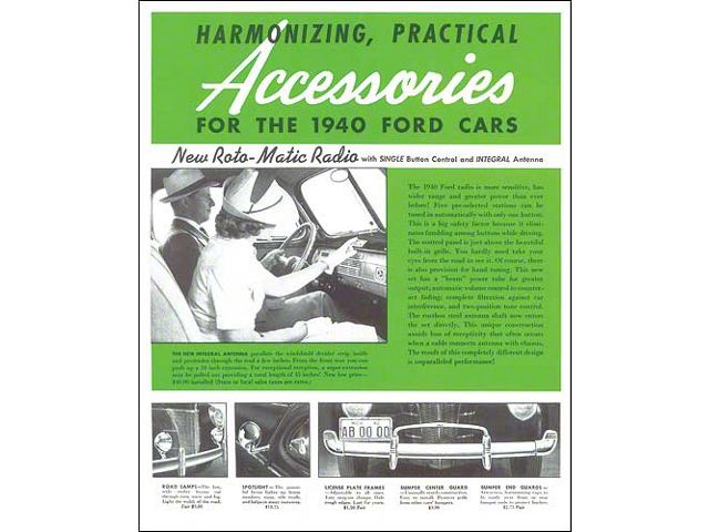 Presenting Genuine Ford accessories that were available for 1940. Two color, 8" X 11" format.
