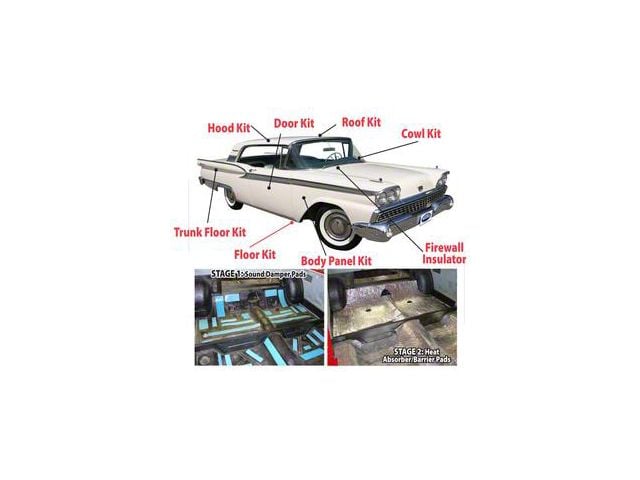 Acoustishield is a multistage thermal-acoustic insulation and sound damping system that gives older cars and trucks the "quiet riding comfort" found in today's new vehicles. Using "state-of-the-art" auto acoustic technology, this combination of Dynamat Xtreme sound damper pads and precut heat shield insulation panels will reduce road noise, exhaust harmonics, mechanical noise, body panel vibration and the effects of radiated and reflected heat. Passenger cabin noise levels are reduced by approximately 50 percent and interior heat is virtually eliminated. Kits are year, make and model specific and are pre cut to exact shape for each area covered. A complete vehicle acoustic kit includes the cowl, floor, roof, trunk, doors and body panels (seat divider, p