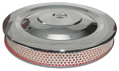 An exact reproduction of the original, with a chrome top and dimpled recesses to fit original wing nut. Includes 289 high-performance decal. Blue painted base includes breather tube and cap. Filter element has correct round hole screen and is correct orange color. Wing nut is not included.