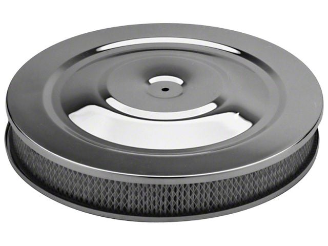 Air Cleaner Kit; Chrome Plated Steel with No Logos; Full-Flo Style; 14 Inch Diameter for 5-1/8 Inch Mount; Features PCV Hook-Up and Mounting Adapter for 4-7/32 Inch Carb Necks; 2-1/4 Inch Paper Element, Mounting Stud and Wing Nut Included
