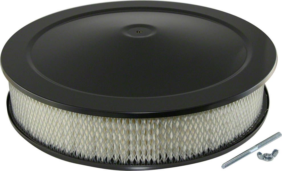 This is a brand new 14 inch round black air cleaner set. It comes complete with top, recessed base, filter and stud with wing nut. This black air cleaner fits single quad carburetors with 5-1/8" neck. Dimensions: 14" x 3".