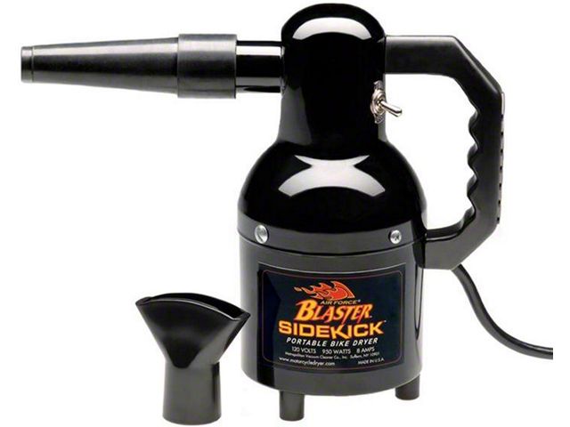 The Blaster® SideKick® is an affordable, high performance, portable car or motorcycle dryer. It features an unbelievably powerful 1.3 Horsepower motor that pumps out 18,000 feet-per-minute of warm (30° above ambient) filtered air, yet at a mere 9.5" high the drier is small enough to stow away in the trunk for quick, on-site show touchups and detailing.