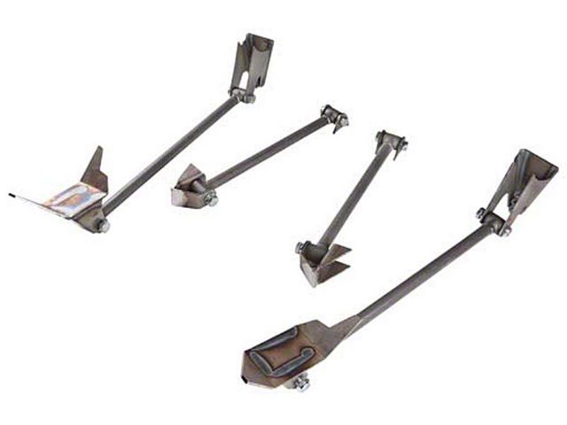 Universal 4-Link Kit, Triangulated. Does not require panhard bar. Includes: poly bushings, .156 wall DOM tubing. Hardware, rod ends, laser-cut & TIG welded brackets are included. The upper bars are 23 inches long. The lower bars are 17 inches long. Use with a 3 inch. axle tube. Made in the USA.