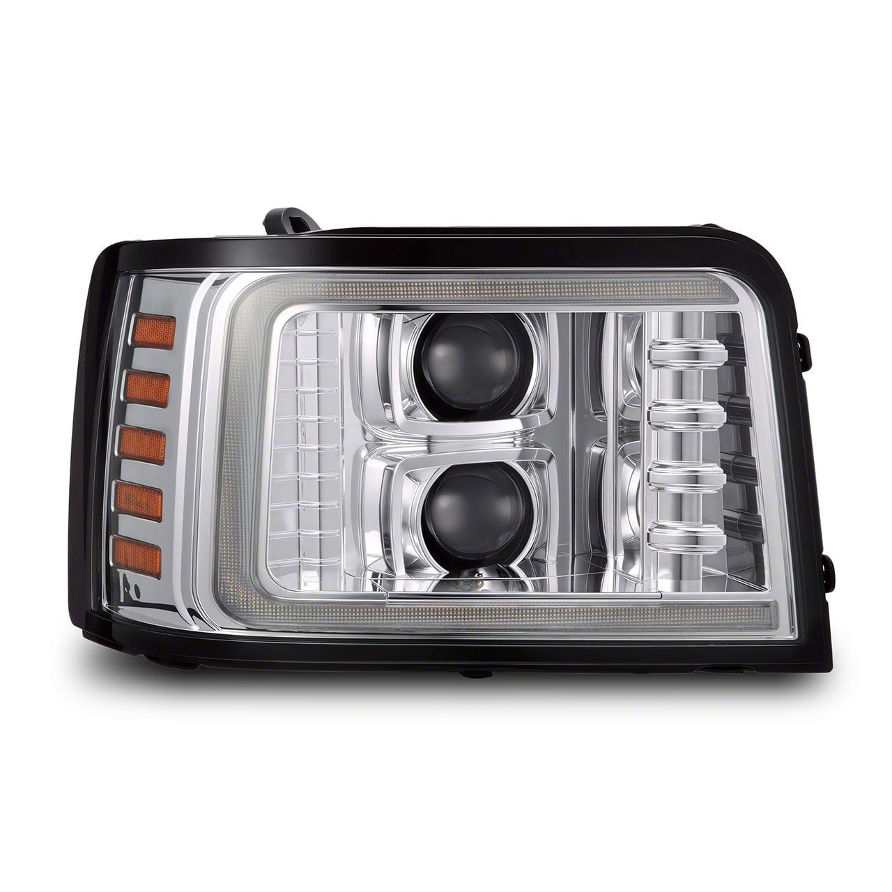 Introducing our Ford OBS LUXX-Series projector headlights, designed for the 9th gen F-Series and 5th gen Bronco. These headlights artfully capture the rugged essence of 4th gen Super Duty trucks while being expertly adapted for the Ford OBS models. A key feature is the switchback LED light tube surrounding the light, functioning as a dynamic DRL. Choose between two color options—white (default) or amber—easily switchable through simple wire adjustments. This light tube also doubles as a sequential turn signal in amber, enhancing both visibility and style. The Ford OBS LUXX-Series projector headlights come equipped with an activation light that functions as a running light when unlocking your vehicle, providing an enhanced visual presence. The top projector delivers dual beam output for both low and high beams, while the bottom projector operates as a DRL, adding a modern touch without being the main light source. Built with precision-engineered LED chips from our factory, these headlights offer reliable performance and superior illumination. Transform your 9th gen F-Series and 5th gen Bronco with the Ford OBS LUXX-Series projector headlights, blending cutting-edge technology and refined design for an upgraded driving experience.