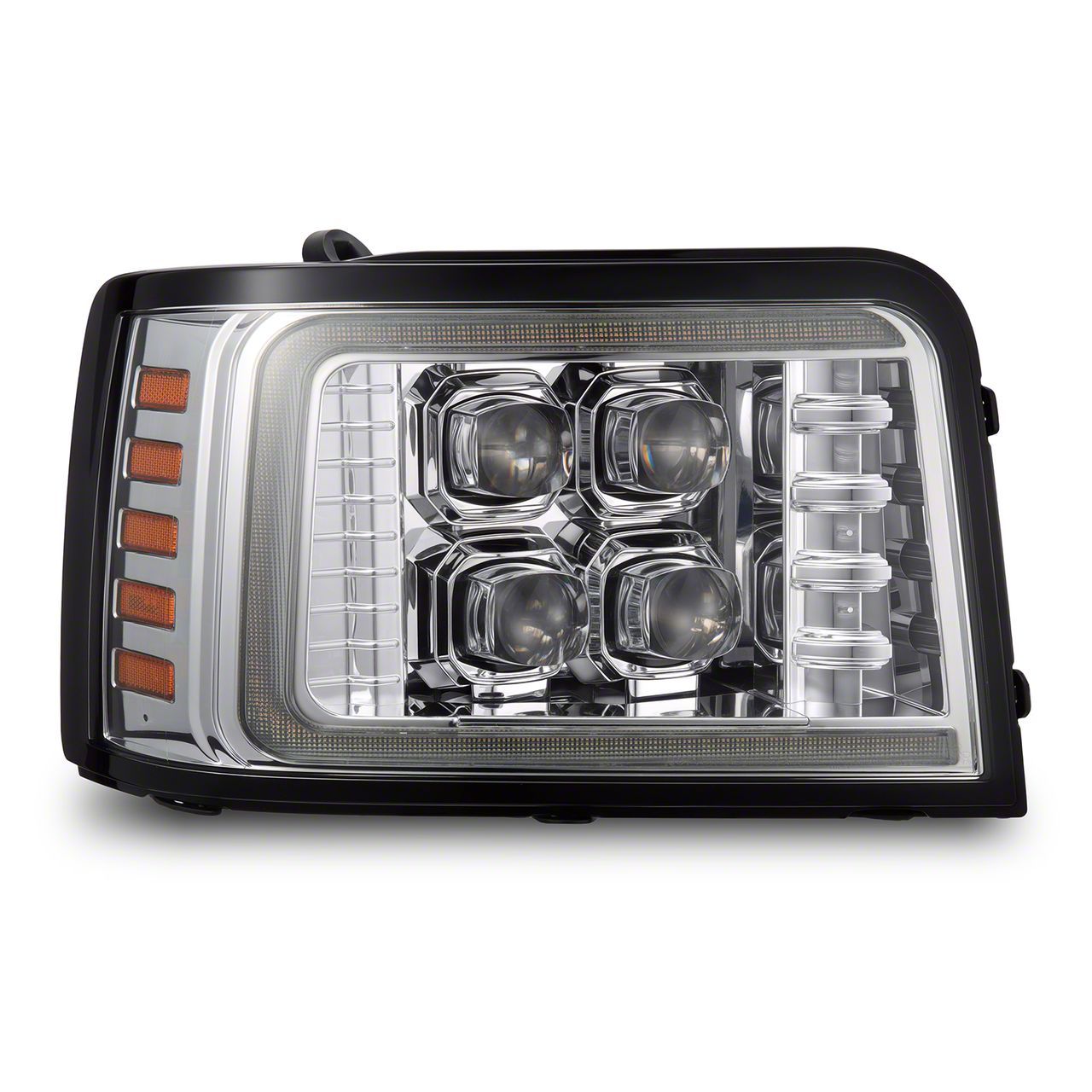 Introducing our Ford OBS NOVA-Series projector headlights, crafted for the 9th gen F-Series and 5th gen Bronco. These headlights embrace the iconic design of 4th gen Super Duty trucks, reimagined for the Ford OBS models. Highlighted by our signature 3D Ice-Cube projector lens, the headlights are surrounded by a switchback LED light tube that doubles as a dynamic DRL. Choose between white or amber DRL colors, easily adjustable via the wiring. The amber LED also serves as a sequential turn signal, boosting both style and safety. Featuring an activation light that engages when you unlock your Ford OBS, the NOVA-Series lights ensure an enhanced presence for your 9th gen F-Series and 5th gen Bronco. All four projectors are optimized for low beams, with the top two projectors switching to high beams. Powered by high-power LEDs, these headlights deliver a sharp 6000K light output, providing superior projection and visibility in all conditions. Elevate your ride with cutting-edge technology and stylish design with the Ford OBS NOVA-Series projector headlights.