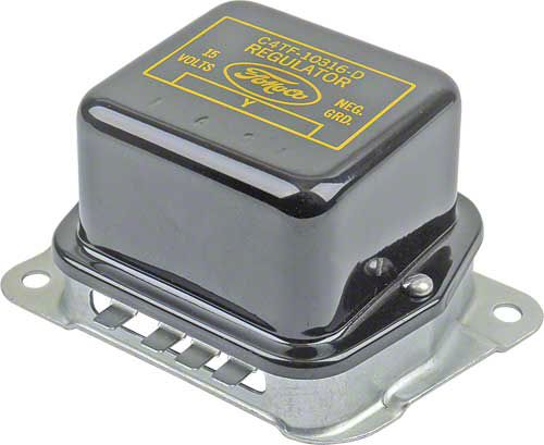 Our reproduction voltage regulators are exact copies of the originals. Painted the correct colors, they feature ink stamped original logos and engineering numbers and have the correct type screws or rivets securing the top to the base. They are rated for use with alternators up to 55 amps. Sorry, the voltage regulator for use with transistor ignition, is not available.
