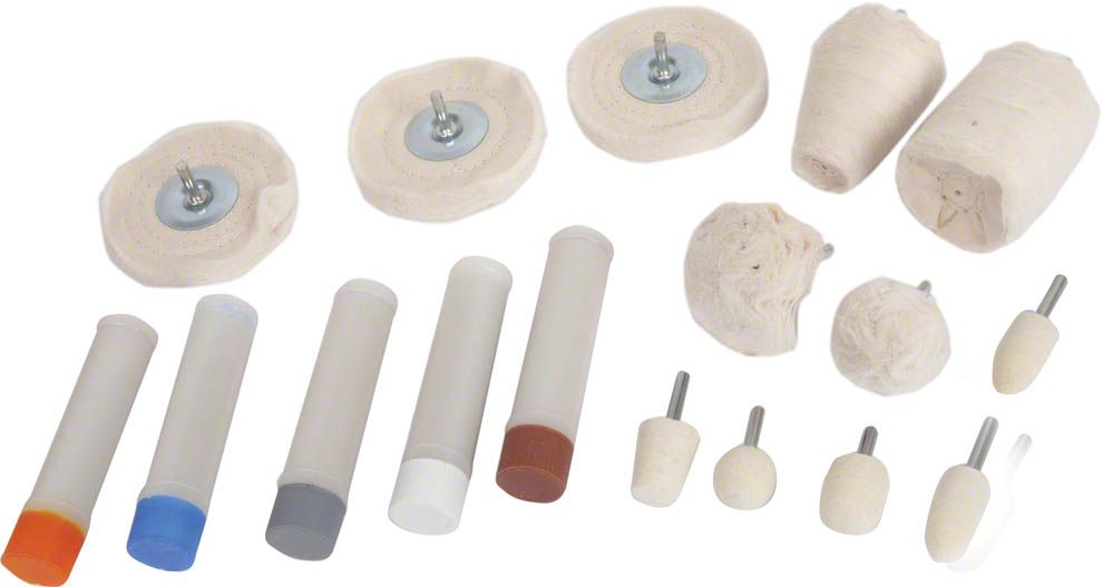 This deluxe polishing kit is designed for steel, stainless, aluminum and plastic automotive components. Utilize your electric drill or pneumatic die grinder with the supplied 1/4" arbors for polishing jobs on or off the vehicle. Kit includes 4 oz tubes of Emery, Tripoli, Jewelers Rouge and White rouge along with an assortment of tapered, cylinder, spiral and wheel buffs for tight spots and open surfaces such as valve covers or air cleaners.
