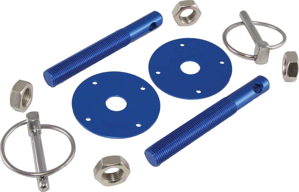 Eckler's universal aluminum Hood Pin Kit is designed just like the ones's used in Nascar. These heavy duty hood pins will secure your hood or trunk yet still allow them to be quickly opened or removed. Every kit includes 2 hood pins, two torsion flip over clips, two self adhesive scuff plates, and the necessary hardware.