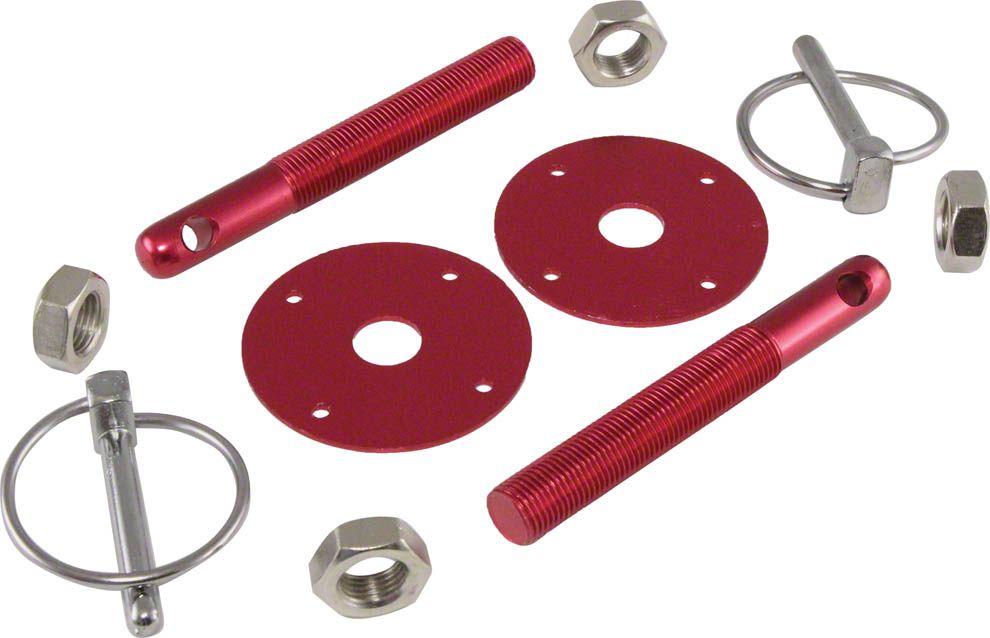 Secure Hood Fastening. The Aluminum Hood Pin Kit in red is engineered to provide a dependable and visually striking method to secure your vehicle's hood. This kit ensures the hood stays firmly in place during high-performance driving or everyday use, improving both safety and appearance. It is ideal for enthusiasts seeking to enhance their vehicle's engine bay aesthetics while maintaining functional security.