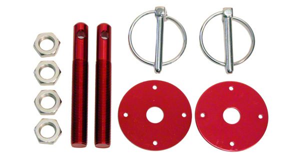 Eckler's universal aluminum Hood Pin Kit is designed just like the ones's used in Nascar. These heavy duty hood pins will secure your hood or trunk yet still allow them to be quickly opened or removed. Every kit includes 2 hood pins, two torsion flip over clips, two self adhesive scuff plates, and the necessary hardware.