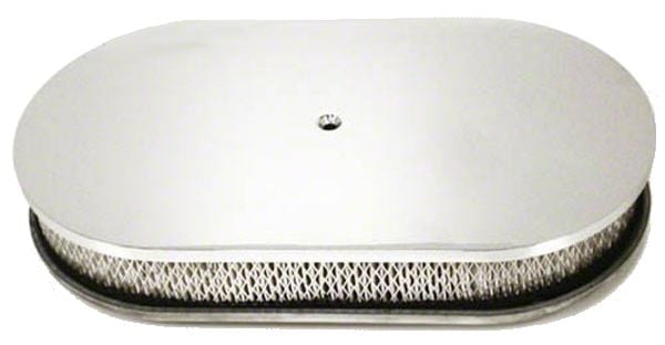 This air cleaner will fit most stock and aftermarket carburetors with a 5-1/8'' diameter carburetor neck like most Carter, Edelbrock, Holley, Rochester, and Quadrajet four barrel carburetors. It also has a raised aluminum base to raise the air cleaner above the carburetor flange. Comes with stainless bolt for mounting. Dimensions: 11-7/8"L x 8-1/4"W x 3"H.