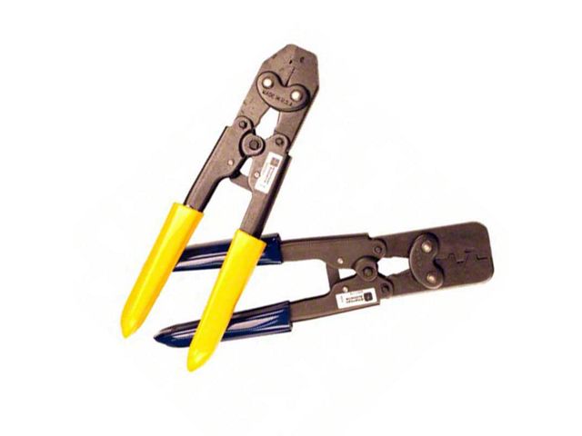 Single crimper used for F-type terminals included in Classic Update and universal harnesses. Wire sizes ranging from 20 gauge to 14 gauge and Double crimper Used for F-type terminals included in Classic Update and universal harnesses. Wire sizes ranging from 10 gauge to 18 gauge, or terminals requiring a two wire connection. Two piece set includes single and double crimpers.