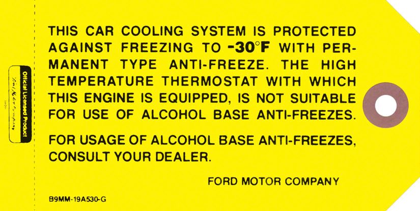 Choose from our complete selection of original reproduction engine antifreeze tags. These tags were reproduced from original Ford pieces in intricate detail and feature correct shape, design, and coloring for the concours restoration.