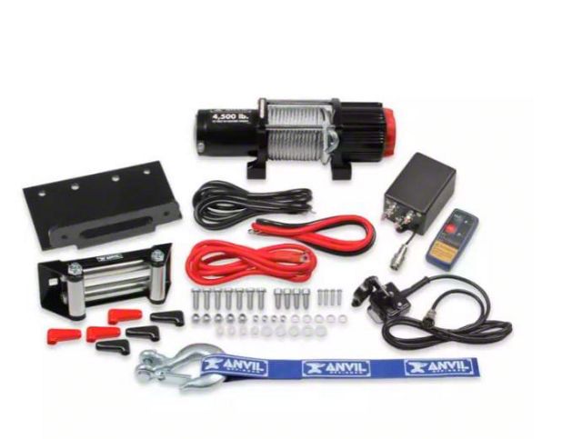 Anvil 12-volt 4,500 lb. winches are ideal for use on ATV's, UTV's, and Car Trailers. This winch is powered by an efficient 3.5HP 12-volt permanent magnet motor w/ 3-stage planetary gear. Choose from a metal cable & 4-way roller fairlead, or a synthetic rope & aluminum Hawse fairlead. The wireless remote control is really handy when loading a vehicle on a trailer, since you can steer the vehicle while controlling the winch. Includes: winch, fairlead, mounting plate, solenoid, handlebar switch, wireless remote, wire & hardware.