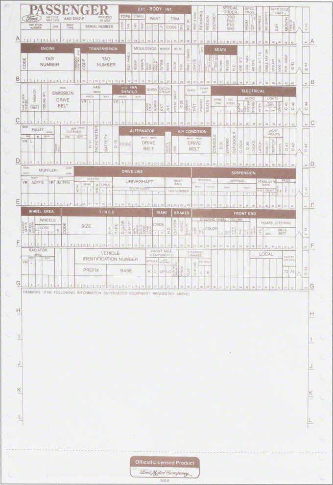 We have the original style build sheets for most years of Galaxie. The build sheet was the document that was used on the production line to properly code all of the factory specifications on your car. As the car was on the assembly line, this sheet would be used to properly install the specified features. These are a blank template build sheet without codes included. You can add the codes to this sheet for your particular specifications to reproduce your original. Because these were normally mounted in the springs of the seat, these are usually in poor shape if located in your car.