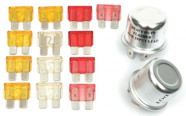 This kit contains two flashers, and a complete set of ATC fuses with a variety of amperage. ATC fuses were an improvement over the original glass Buss style, and many customizers choose them for their custom harnesses. The flasher units can be used for turn signals or safety flashers. It's a great kit to have on hand in your garage too!