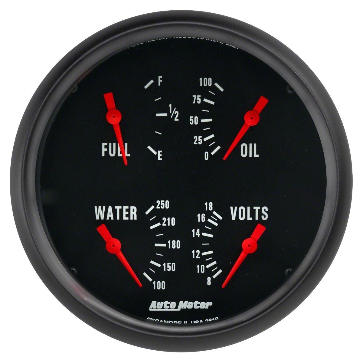 Compact Multi-Readout Gauge. The Auto Meter Z-Series 5-Inch Quad Gauge is a versatile, space-saving solution designed to give you critical data at a glance. This compact unit combines four essential gauges—oil pressure, water temperature, voltage, and fuel level—into a single sleek module. Ideal for performance and custom applications, the Z-Series Quad Gauge ensures that you're always aware of your engine's vital stats.