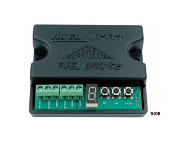 The Fuel Bridge wires in between your fuel level gauge and sending unit and allows you to use any AutoMeter fuel level gauge with any stock or aftermarket sending unit. The triple push button with LED display allows for easy set up. This unit is a compact size at 3 1/8" wide x 2 1/2" tall x 3/4" thick. A low fuel level warning is available at 10% and off at 15%. It can turn on an LED or relay.
