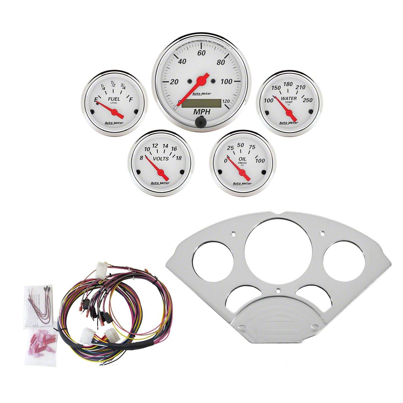 Includes 3-1/8" Arctic White electric speedometer and 2-1/16" electric fuel level (0/30 ohm), water temperature, oil pressure, and voltmeter.