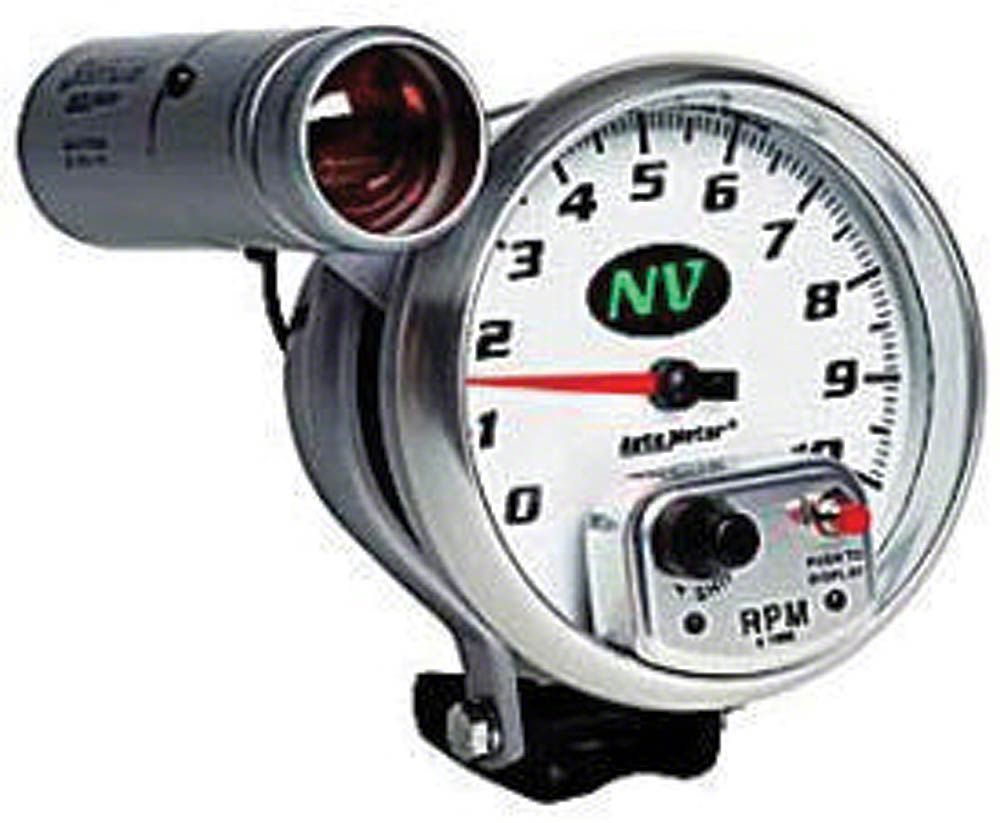 This AutoMeter NV tachometer features a white face, silver anodized bezel, black numbering and green background lighting that shines through the dial. A glowing red pointer provides clear control and visibility. The AutoMeter NV tachometer uses LED technology, which produces no heat and will last a lifetime.