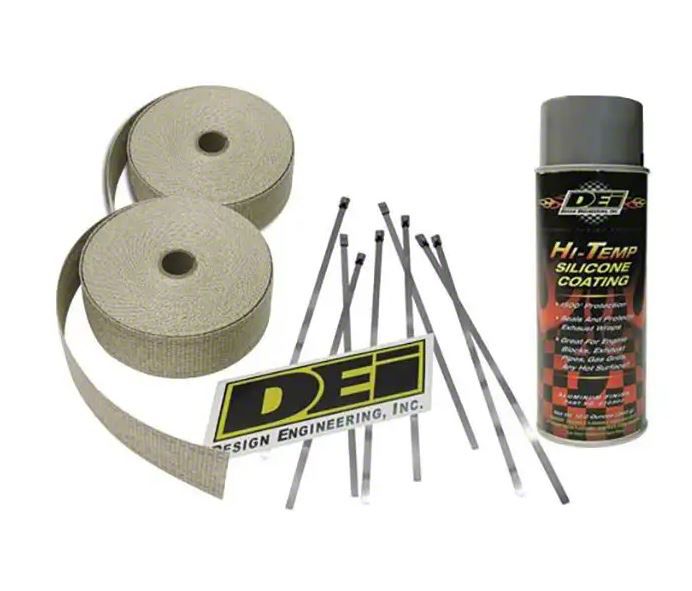 An all-in-one kit for wrapping a set of headers or motorcycle pipes. Automotive kit includes two 2” x 50ft rolls of exhaust wrap one can of HT Silicone Coating & Locking Ties. The header wrap kit is enough for any set of V8 headers. The Header Wrap Kit will wrap from the top of the header where it bolts to the heads all the way down to the collector. Exhaust Wrap Kits save you time and money