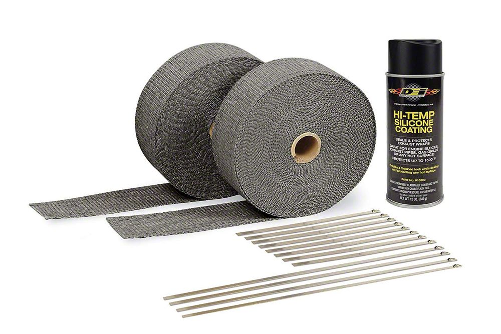 An all-in-one kit for wrapping a set of headers or motorcycle pipes. Automotive kit includes two 2” x 50ft rolls of exhaust wrap one can of HT Silicone Coating & Locking Ties. The header wrap kit is enough for any set of V8 headers. The Header Wrap Kit will wrap from the top of the header where it bolts to the heads all the way down to the collector. Exhaust Wrap Kits save you time and money