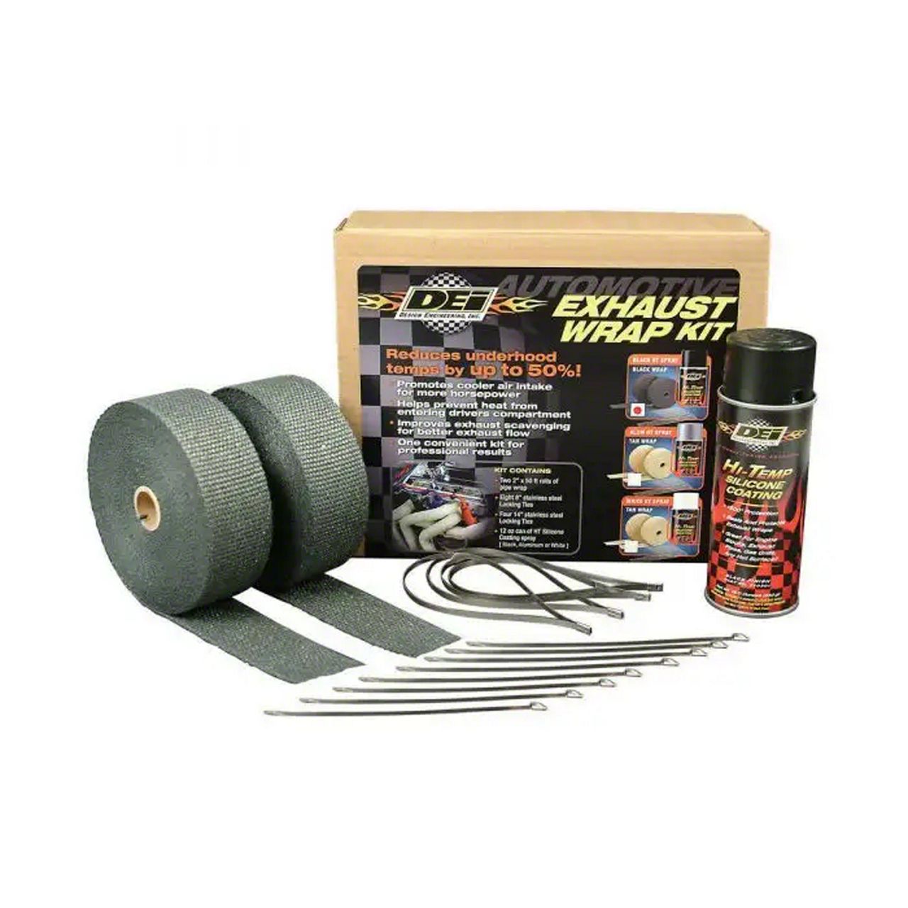 An all-in-one kit for wrapping a set of headers or motorcycle pipes. Automotive kit includes two 2” x 50ft rolls of exhaust wrap one can of HT Silicone Coating & Locking Ties. The header wrap kit is enough for any set of V8 headers. The Header Wrap Kit will wrap from the top of the header where it bolts to the heads all the way down to the collector. Exhaust Wrap Kits save you time and money