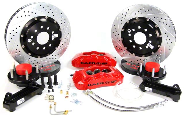 This system features the 6-piston, 6P caliper mounted to a 13", 2 piece slot, drill, zinc plated rotor. The 6P caliper has D.O.T compliant dust and weather seals and uses the popular D0731 pad type. Billet aluminum hubs come assembled with premium bearings packed with Redline synthetic grease and billet dust caps. Rotors are pre-assembled with NAS high grade stainless hardware. All mounting brackets, stainless braided hoses and hardware are also included. The 13" Pro+ is designed to fit most 17” or larger wheels.