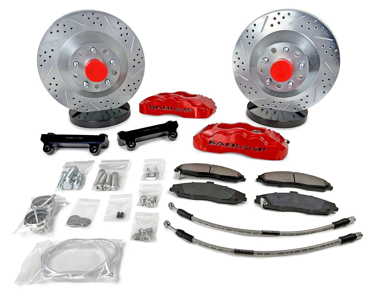 This system features the 6-piston, 6P caliper mounted to a 13", 1-piece slot, drill, zinc plated integral hub rotor. The 6P caliper has D.O.T compliant dust and weather seals and uses the popular D0731 pad type. Rotors come with bearing races installed and premium bearings packed with Redline synthetic grease and new dust caps. All mounting brackets, stainless braided hoses and hardware are also included. The 13" Pro is designed to fit most 17” or larger wheels.