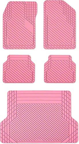 Construction and Appearance. Manufactured from 100% recyclable TPE material, these mats are built to last, offering consistent performance due to their injection-molded construction. Their sleek, pink color adds an ultramodern touch to your vehicle's interior, and the contoured 3-dimensional design channels debris into reservoirs for easy cleanup.