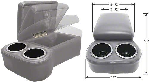 It features two king size drink holders, now with chrome edge trim, plus the hinged top opens to reveal a large storage compartment. The console top is softly padded to provide you with a comfortable armrest and a sewn-in strap is provided to secure the console to the seat.