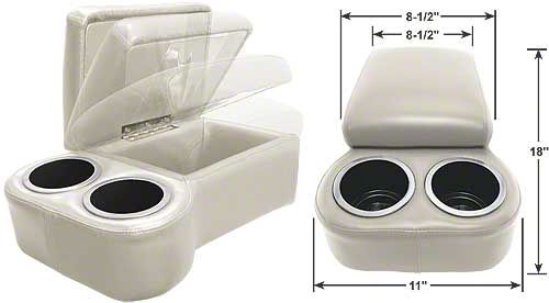 How's this for a great idea? This BC Seat Cruiser Console is specifically designed to fit on any bench seat, it features 2 king size drink holders, now with chrome edge trim, plus the hinged top opens to reveal a large storage compartment. The console top is softly padded to provide you with a comfortable armrest & a sewn-in strap is provided to secure the console to the seat. Available in a dozen beautiful colors, the entire console is upholstered in long wearing automotive grade vinyl with double stitched French seams to complement almost any interior.