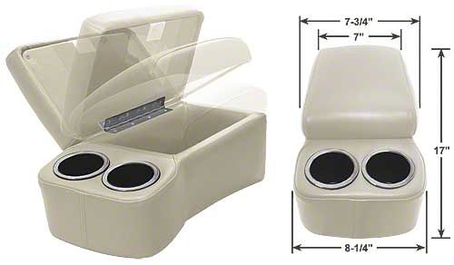 Both have a softly padded hinged top that opens to reveal a spacious storage compartment, a sewn-in strap that allows you to secure the console to the seat, chrome accents on the cup holders and both are available in a dozen beautiful colors.