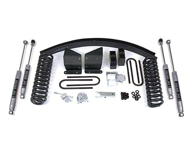 In the rear the base kit utilizes a high-strength lift block, longer u-bolts and a matching set of NX2 Nitro shocks.