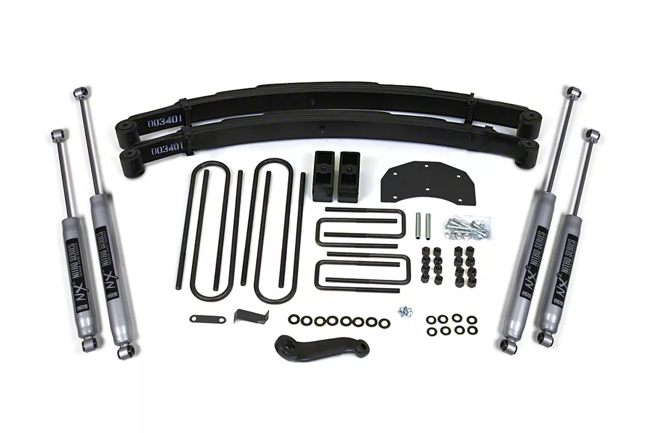 Performance Lift Kit. The BDS 4-Inch Suspension Lift Kit with NX2 Nitro Shocks enhances your 1980-1996 Ford F350 Monobeam 4WD by improving its stance, off-road capability, and load-bearing performance. Designed specifically for solid front axle suspensions, this kit allows for clearance of up to 35-inch tires, ensuring your truck performs optimally in demanding conditions.
