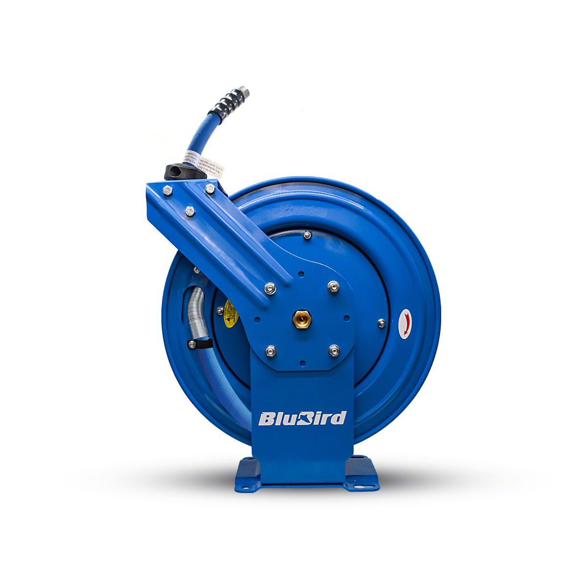 Blubird dual arm air hose reel is an ultimate combination of corrosion resistant powder coated heavy duty steel, single adjustable guide arm, L-Shaped base with groove reinforcement ensuring a stable support along with world best Air hose by BluBird. This Hose Reel utilizes a fully enclosed multi-position 12-point ratchet spring system to lock hose at designed shorter and longer length. Brass swivel joints hose inlet connection protecting against leaks while reel stopper and 4 non snag rollers reduce hose abrasion. This hose reel can be mounted on floor, wall, ceiling etc, perfect for commercial and industrial use.