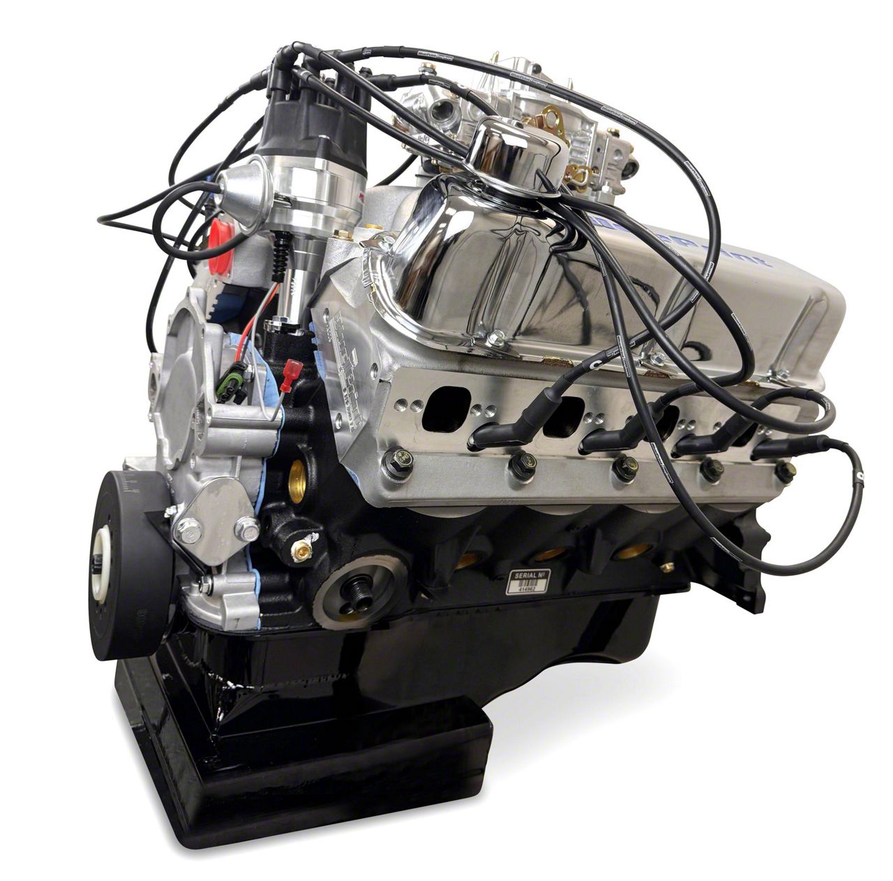 Horsepower & Torque: 541 Horsepower / 519 FT LBS/Compression Ratio: 10.0:1/Aluminum Heads/Hydraulic Roller Cam/Forged Crank/Forged PistonsBlock:NEW High Strength Cast Iron Block/4.125" Bore/4-Bolt Main/1-Piece Rear Main Seal/Passenger Side Dipstick/Rotating Assembly:New Forged Crankshaft/4.000" Stroke/Forged 6.2" Connecting Rods/Forged Pistons/Internally Balanced Front and Rear/Cylinder Heads:Aluminum Cylinder Heads/62cc Chamber/2.08" Intake / 1.60" Exhaust Valves/205cc Intake / 70cc Exhaust Runners/Cam Specs:Hydraulic Roller/.608 Intake / .608 Exhaust Lift/248 Intake / 258 Exhaust Duration/@.050-114 Degree Lobe Separation/Also Includes:870cfm Holley Carburetor/Single Plane Intake Manifold/Pro Series Distributor/Valve Covers/Front Sump Oil Pan /Timing Cover/Harmonic Balancer/Spark Plugs and Wires/30-months / 50,000 miles