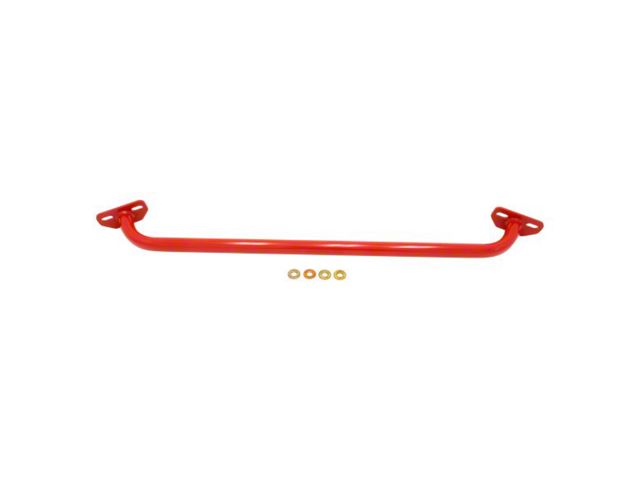 Construction and Appearance. This shock tower brace features a robust construction made from DOM 1/4-inch steel tubing and laser-cut 1/4-inch steel plate, ensuring durability and strength. It is fully MIG-welded and finished with a vibrant red powder-coated finish, adding a sleek, performance-oriented look to your vehicle.