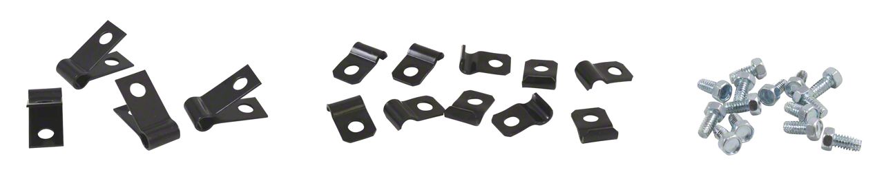 Replace your rusty or broken brake line clips with these quality reproductions. Kit includes 14 clips with mounting bolts, 28 pieces total. This convenient kit includes the four clips needed at the front cross member as well as the multiple clips used along the rear radius rods. Ford used these two style clips in different quantities between 1939-48, so you may even have enough left over to install lines on that neglected second car. Don’t take any chances and make sure your brake lines are held fast with the proper Ford designed clips.