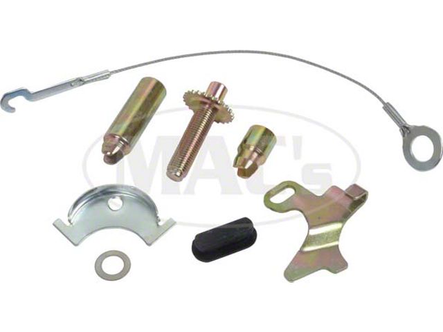 Self-adjustment takes place when the vehicle is in reverse and the brakes are applied, or when the parking brake is engaged. The cable or link attached to the anchor pin pulls the lever mechanism based on the movement of the secondary brake shoe. Wear prevents this from happening. The kit contains 1 cable, 1 guide, 1 lever, brake shoe adjuster and hole plug. One kit does one wheel. It is for the right (passenger) side only.