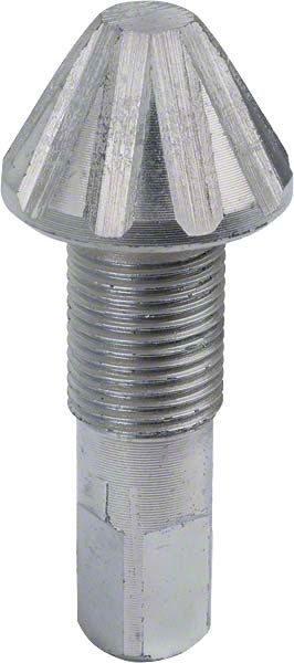 This goes through the backing plate so you can adjust the brakes. To remove the brake adjustment wedge, first remove the brake shoes and turn the wedge clockwise until it is loose in its housing. Tap the square end to pop off the cap, and the wedge can then be removed.